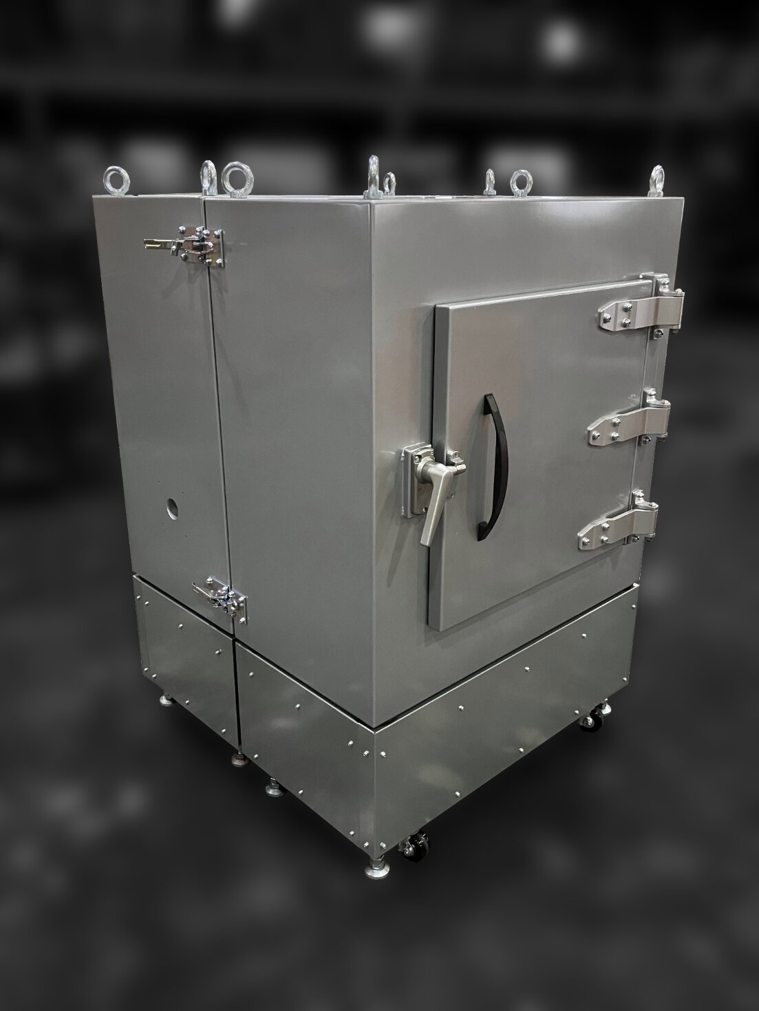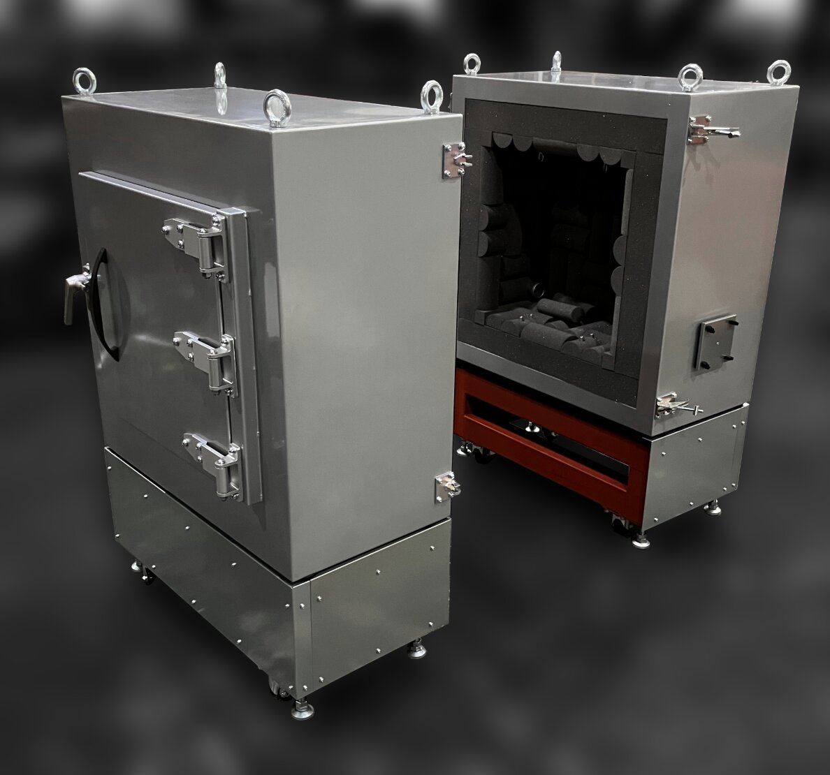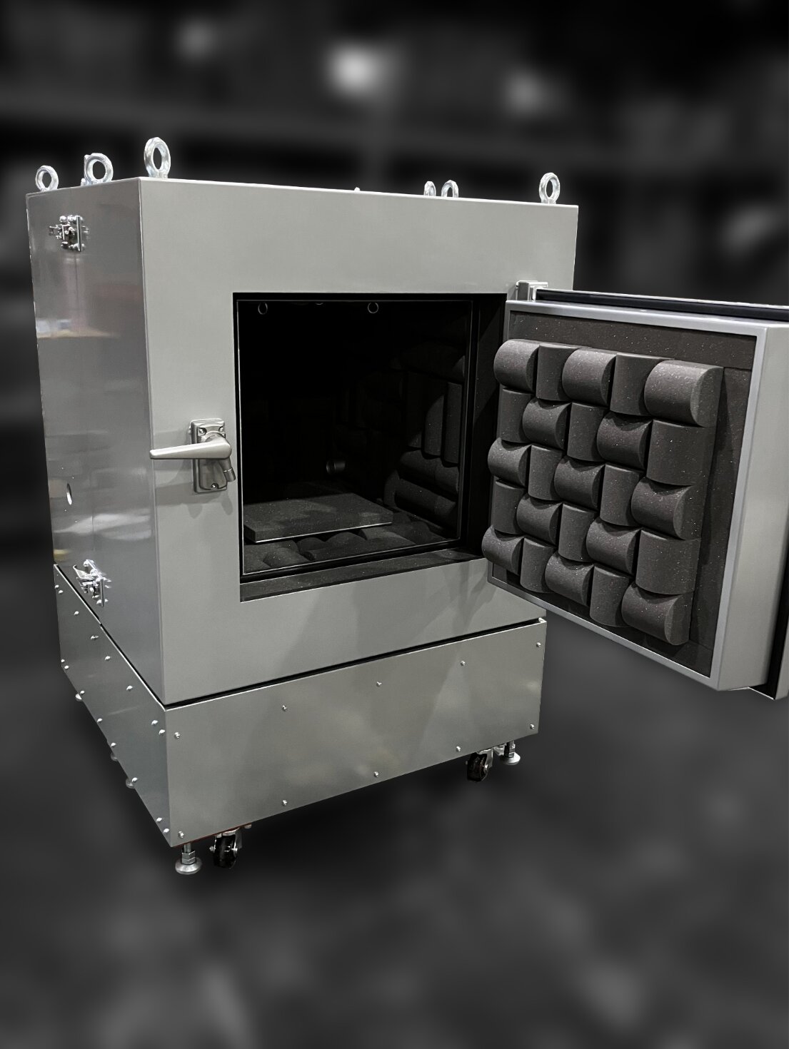 The interior is equipped with a sound-absorbing layer, while the enclosure adopts a multilayer sound-insulating panel structure. In addition, the unit includes wiring ports, an airtight handle, removable eyebolts, and eyebolts for microphone installation, making it easier to set up test specimens and measurement systems.